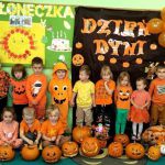 Wspólnie uczestniczyliśmy w zajęciach, podczas których poznaliśmy bardzo zdrowe i urodziwe warzywo jakim jest dynia. Dzieci przyniosły do przedszkola dynie i ubrały się na kolor pomarańczowy. „Dzień Dyni” pozwolił nam poznać wielką różnorodność dyń i wzbogacił naszą wiedzę na ich temat. Wzięliśmy udział w licznych zabawach : dyniowe kręgle, slalom dyniowy, dyniowe zawody, skoki przez dynię oraz ziarnko do ziarnka. Dzieci wykonały również piękne prace plastyczne, lampiony które służyły nam do dekoracji fotobudki .