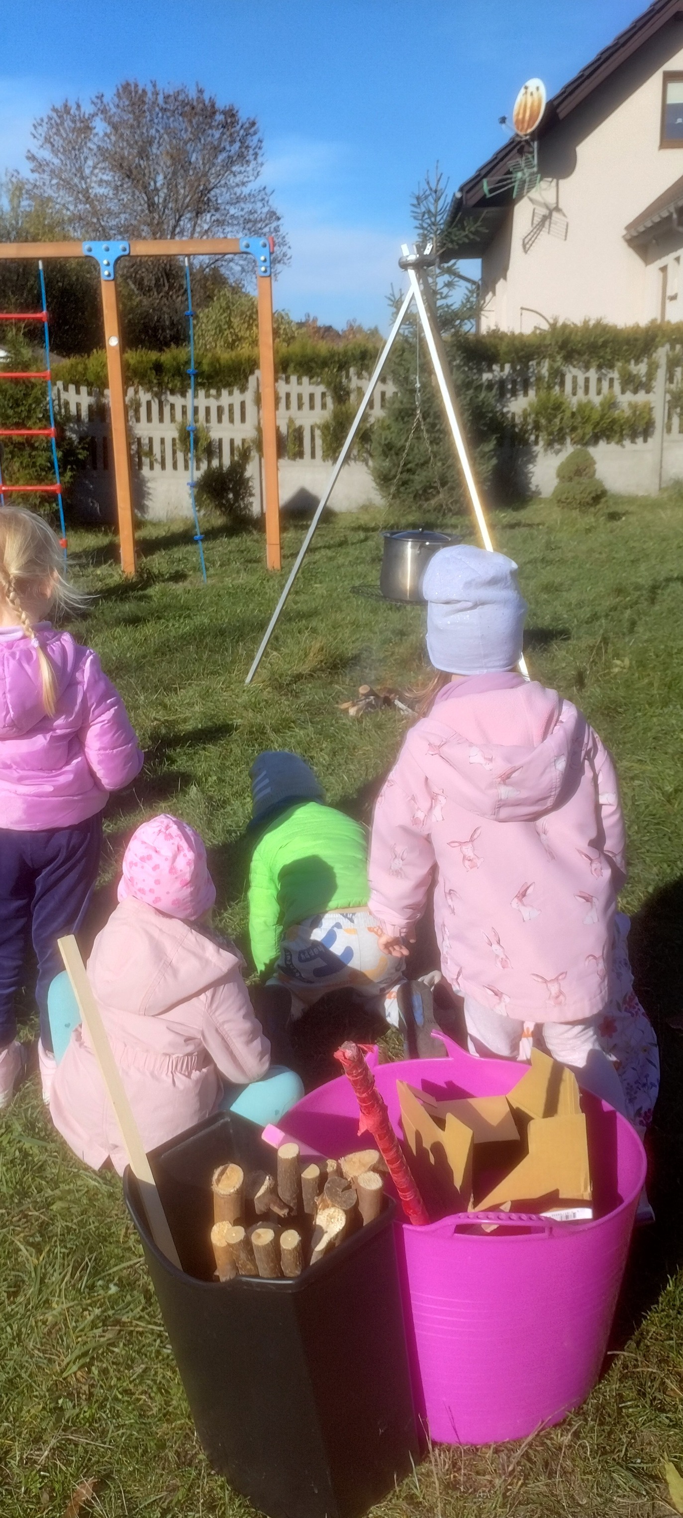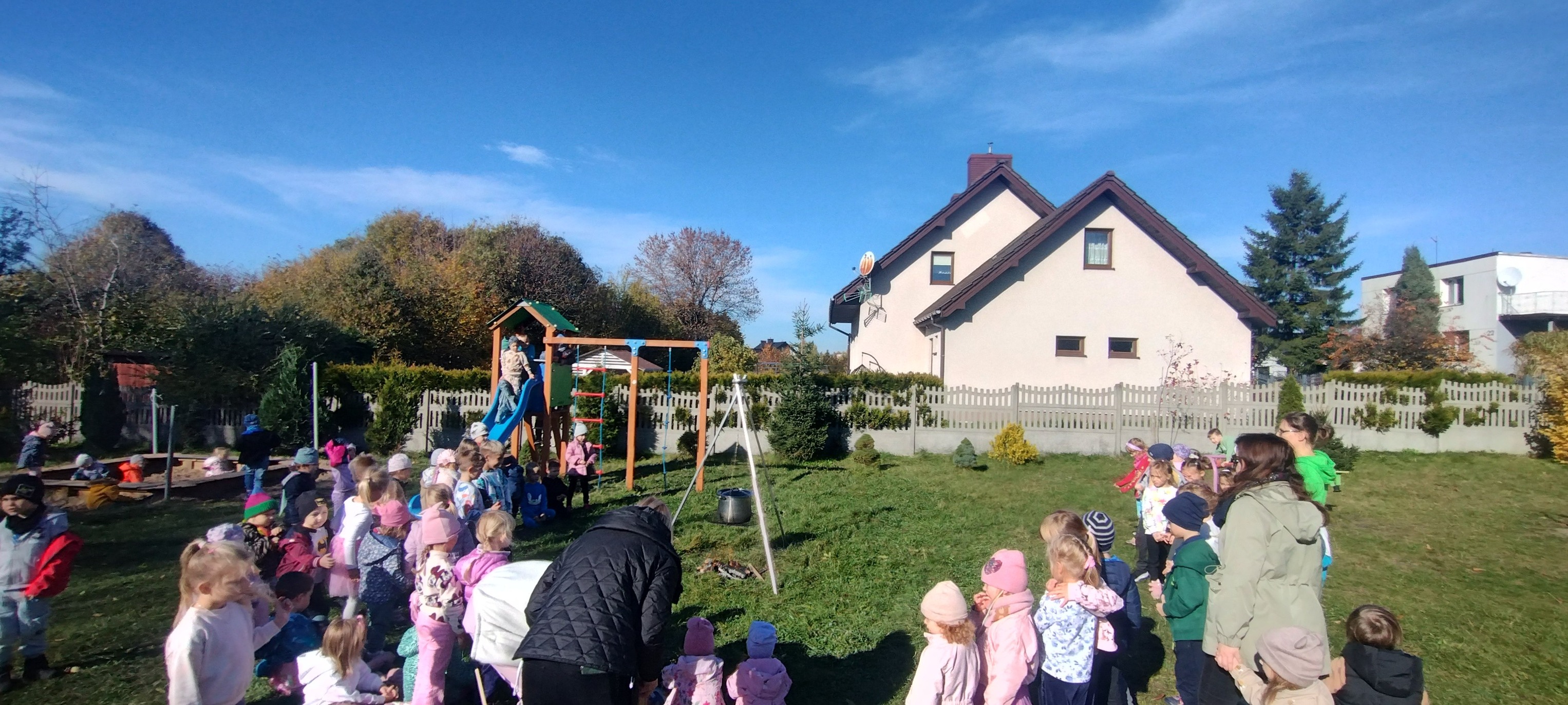 Na początku zabawy ruchowe, piosenki, w ogrodzie przedszkolnym czekała na dzieci niespodzianka, ognisko a w nim pieczone ziemniaki, były zabawy, piosenki, zawody, był to pięknie spędzony dzień.