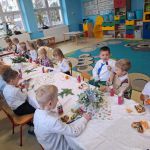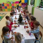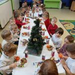 W dzień przedszkolnej wigilii panowała radosna, ożywiona atmosfera. Świąteczne dekoracje oraz dzieci w galowych strojach wprowadzały nastrój oczekiwania na wyjątkowe, niecodzienne wydarzenie. Uroczystość rozpoczęły wspólne życzenia i kolędowanie. Na stole pojawiły się świąteczne przysmaki.