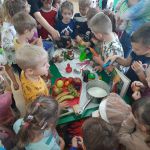 Dzieci pełne radości i nowego doświadczenia w swoim „kąciku kuchennym” naśladowały prace wykonywane przez panie kucharki, a także wykonały piękne prace plastyczne pt. „Pani Kucharka przy pracy”.